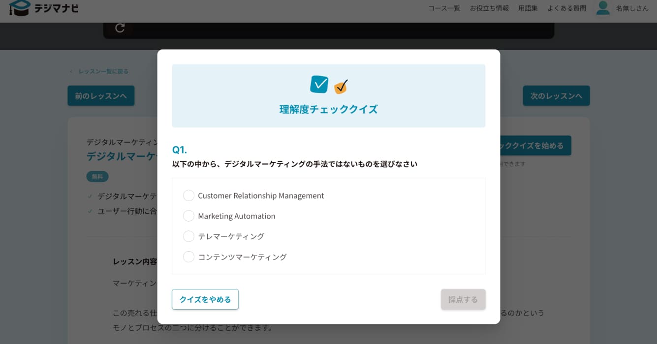 その点、デジマナビはカリキュラムが網羅的に整理されており、マーケティングの全体像を理解しながら学習を進めることができます。