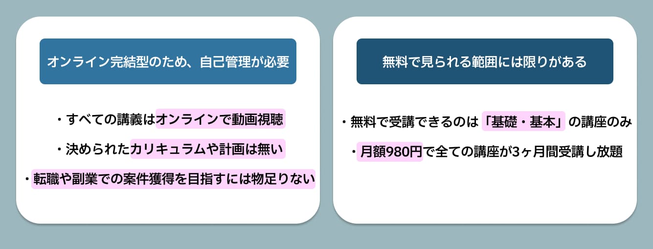 また、無料で見られる範囲は一部に限られているため、より深く学びたい場合は有料プランの検討が必要になります。