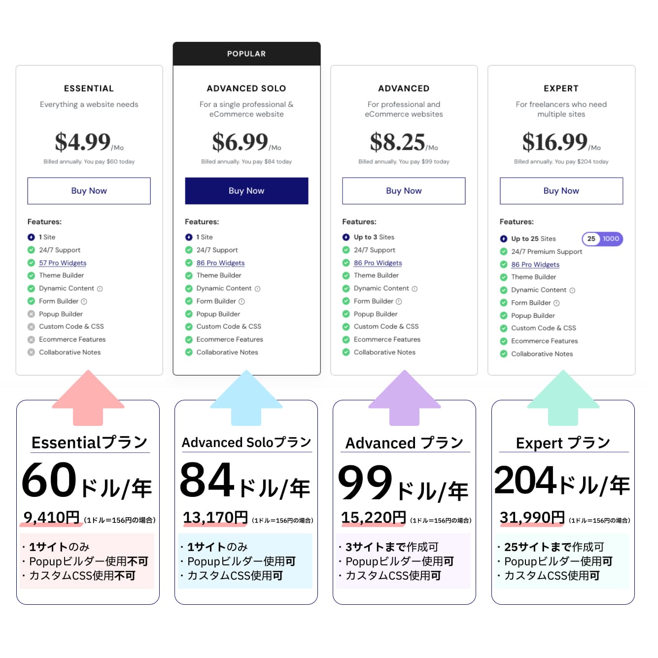 EssentialプランとAdvanced Soloプランの違いはPopupビルダー、カスタムCSSの有無とProウィジェットの数ですが、Popupビルダーは無料のプラグインも多く存在します。カスタムCSSも使用する機会はそれほど多くありません。(ほとんどの場合styles.cssで対応できます)