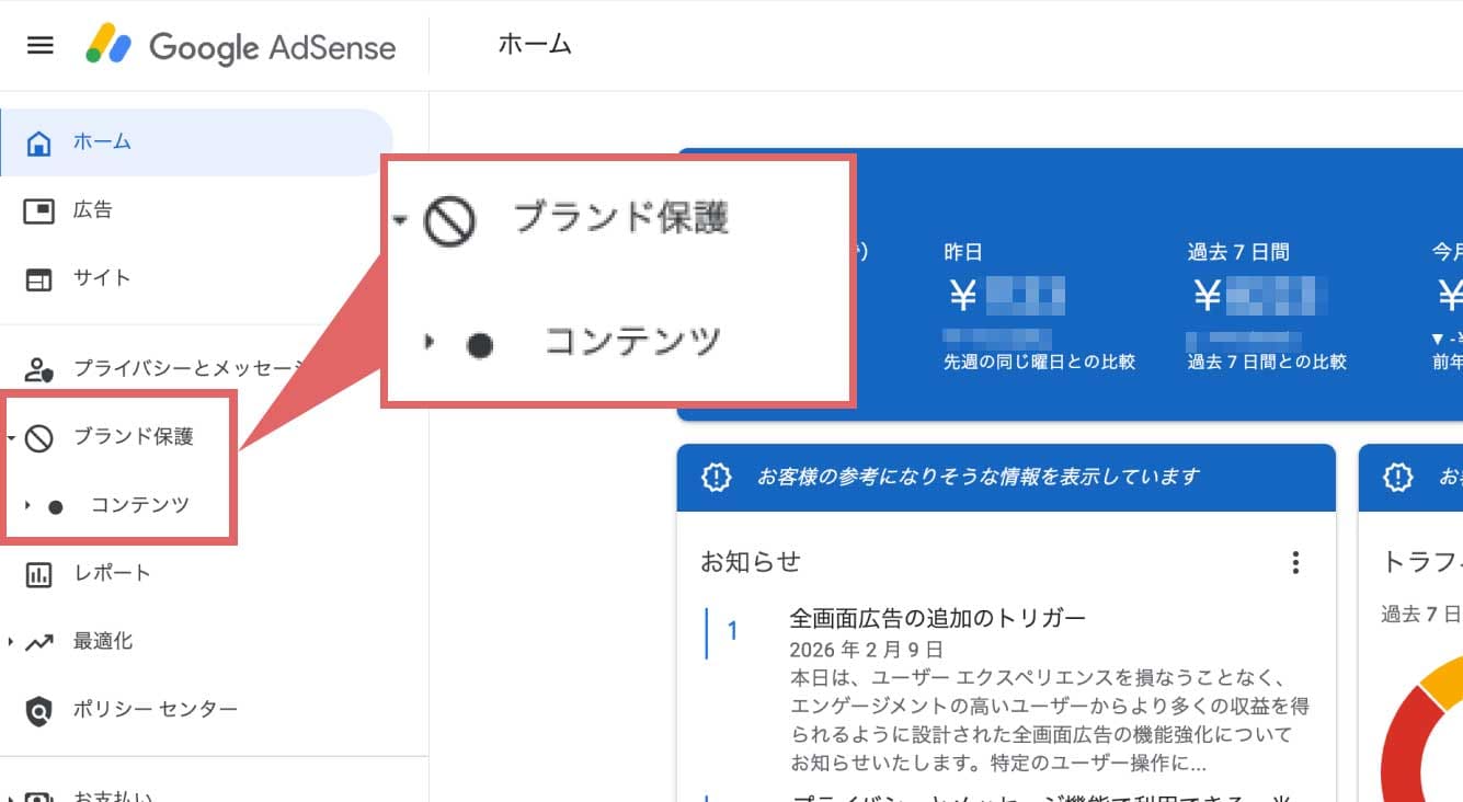 ↑Googleアドセンスのメニューから「ブランド保護」をクリックし、「コンテンツ」をクリックします。