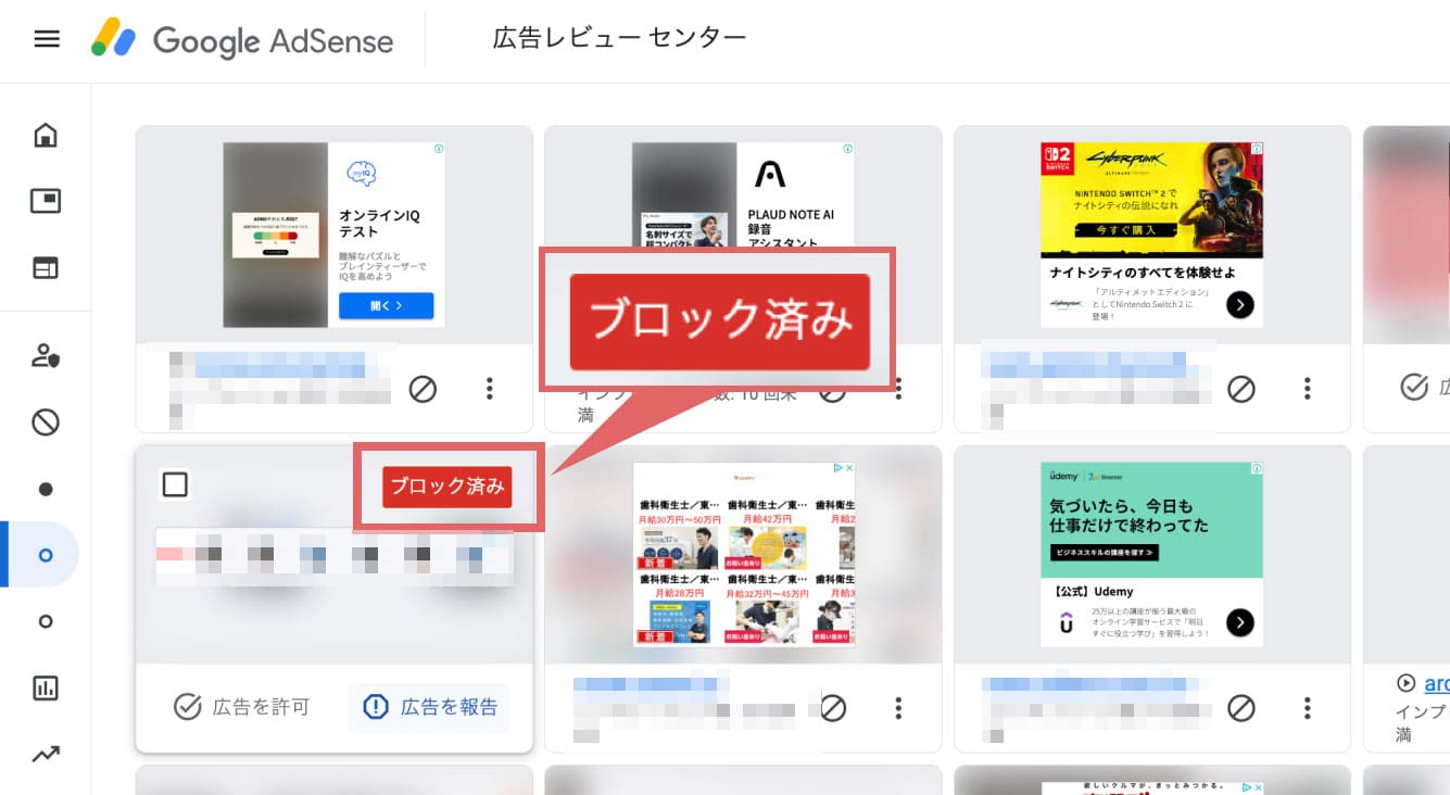 ↑表示をブロックした広告には「ブロック済み」という表示が追加されます。