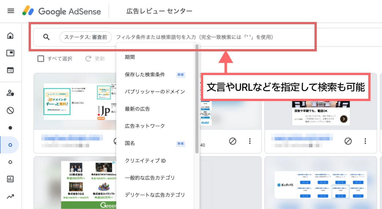 ↑広告レビューセンター画面上部では、広告の文言や遷移先URLなどで広告を検索することも可能です。